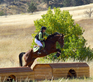 Highboy did learn a valuable piece of jumping form today, too. Because he's so big and athletic, he has learned to tuck his front legs and jump big, but he tends to jump big enough that he then generally doesn't need to tuck his hind legs. On cross-country it's really important to get all of your limbs over the fences, because if you hit them they don't move. Highboy was being lazy with his hind legs at the beginning of the ride, and over a coop that laziness bit him in the haunches when he rapped his hind legs hard on the wood. He was wearing leg protection so no harm was done, but I'm sure he felt it.