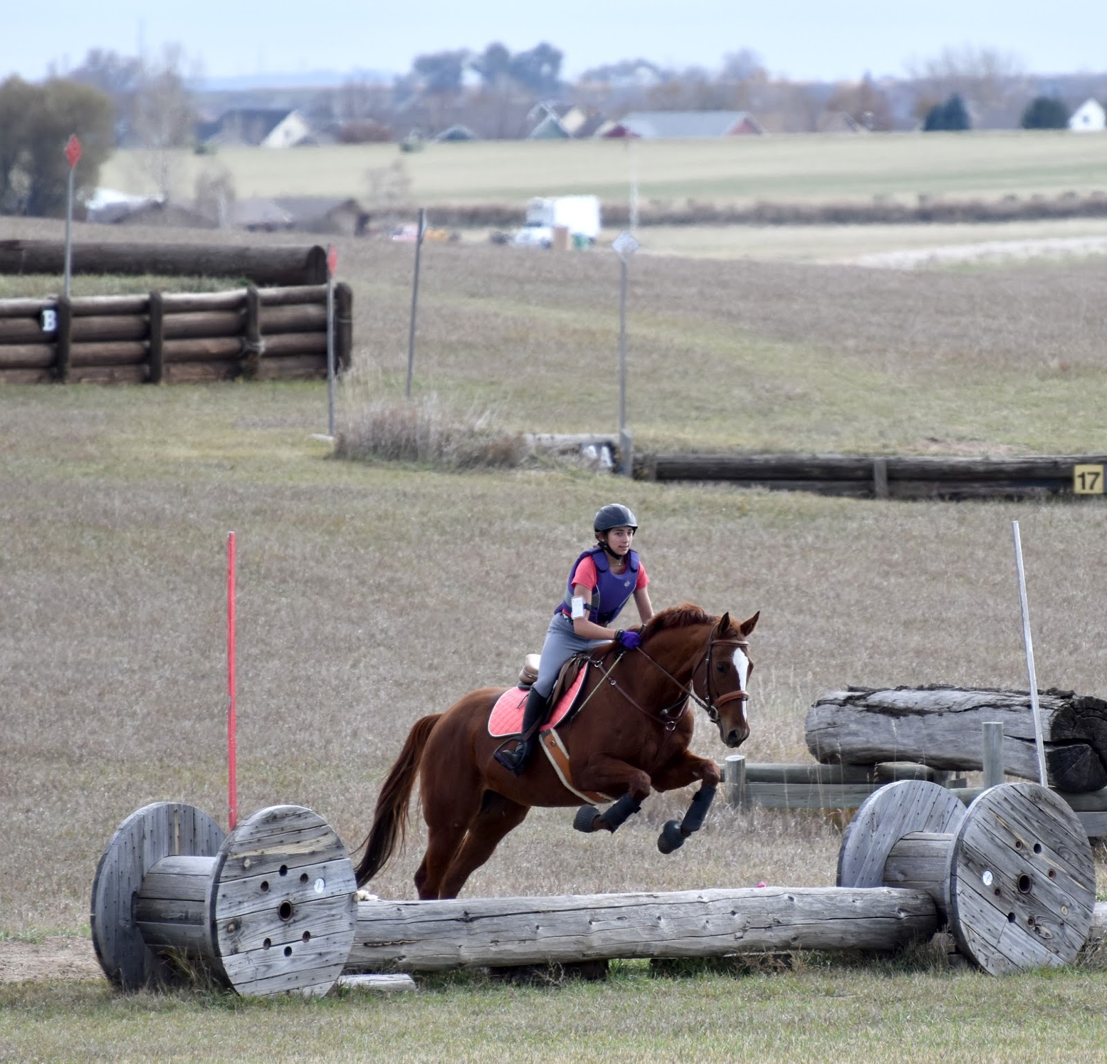 The second round of the course went very differently for Raven. She had figured out that this job was all about galloping and jumping out the gallop, and she had already seen all her fences once. Now that she knew the objective she was all business, as most good mares are. She was strong in her gallop, but listened carefully when I would ask her to half halt and rebalance herself for a turn or a larger fence. I let her jump this pile of logs out of the gallop since it was a straightforward approach and a safely ramped fence, and she took it like a steeplechase horse! I wouldn't do every fence this way for safety reasons, but she sure enjoyed this one!