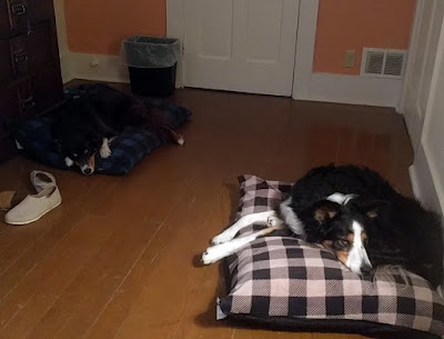 Our cabin was the same one we had stayed in the last time we made a trip here, and the evenings were spent eating good food, playing games. Of course I had to go to sleep early, and each night I was joined by the dogs. Most nights they would fall asleep with me on the bed, then when Owen came to bed he would send them to the dog beds. They always gave him crusty looks, and Miles tried to explain that the border collies ALWAYS sleep with me on trips. Owen literally had to shove them both off the bed the first night. This woke me up so I used the restroom while I was awake. As soon as I was out of bed the dogs jumped up again to lie down in my spot. When I returned from the restroom I just quietly said, "off," and they hopped down politely. This left Owen rolling his eyes, but it all worked out in the end.