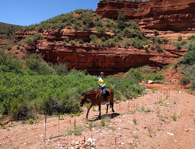 Rawhide is always ready to argue, but when I don't engage with him he settles down nicely. He seems puzzled that I don't get wound up about things, and that if he makes mistakes it just earns him another try. I started him as I do most of my horses under saddle, with a simple routine we repeat every day. Grooming at the barn, tacking up, going to the round pen or arena, lunging a little bit, mounting and walking, trotting, cantering, practicing starts and stops, then walking back to the barn when we are done.