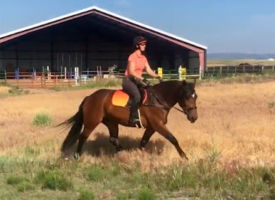 I'm very pleased with how Zora reaches through her topline to round out her frame, and is looking for the contact with my long reins. I generally ride with long reins on green horses to encourage them to find their own balance, and this is especially important with a draft cross like Zora who would have a natural tendency to get heavy on the forehand. I don't want the rider to have to work that hard to hold her up and balance, so out to the field we go to get the impulsion and movement all the way from her haunches through her back to her shoulders. It creates a beautiful frame and a balanced horse who can carry herself nicely not just in the flat level arena, but also up and down hills.